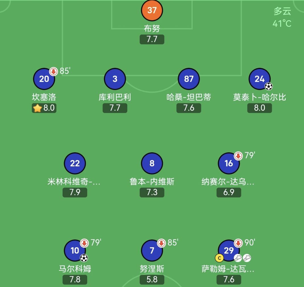 第63分钟,努涅斯在反击中接到马尔科姆的直塞,单刀面对门将挑射将球打高,再次浪费好机会。赛后努涅斯只有5.8分的评分,新月出场球员中最低。努涅斯首次为新月出战正式比赛,他的表现不及格。努涅斯在本菲卡成名,以8500万欧元的转会费加盟利物浦,在利物浦因为经常踢丢必进球而被球队放弃。今年夏天,利物浦以5300万欧元的转会费将努涅斯出售给新月。